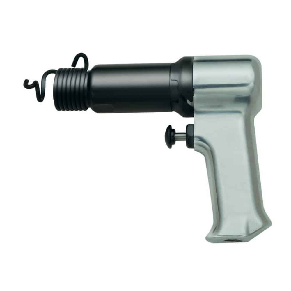 The 121-K6 air hammer kit is an 8-piece kit combining the IR 121 / IR 121-Q air hammer, blow-molded black carrying case, and (6) six assorted chisels. Chisels included are: (1) 3/4″ flat blade chisel, (1) punch chisel, (1) claw ripper-edging tool, (1) single blade cutter, (1) kwik cutter, (1) vee chisel-spot welder breaker.